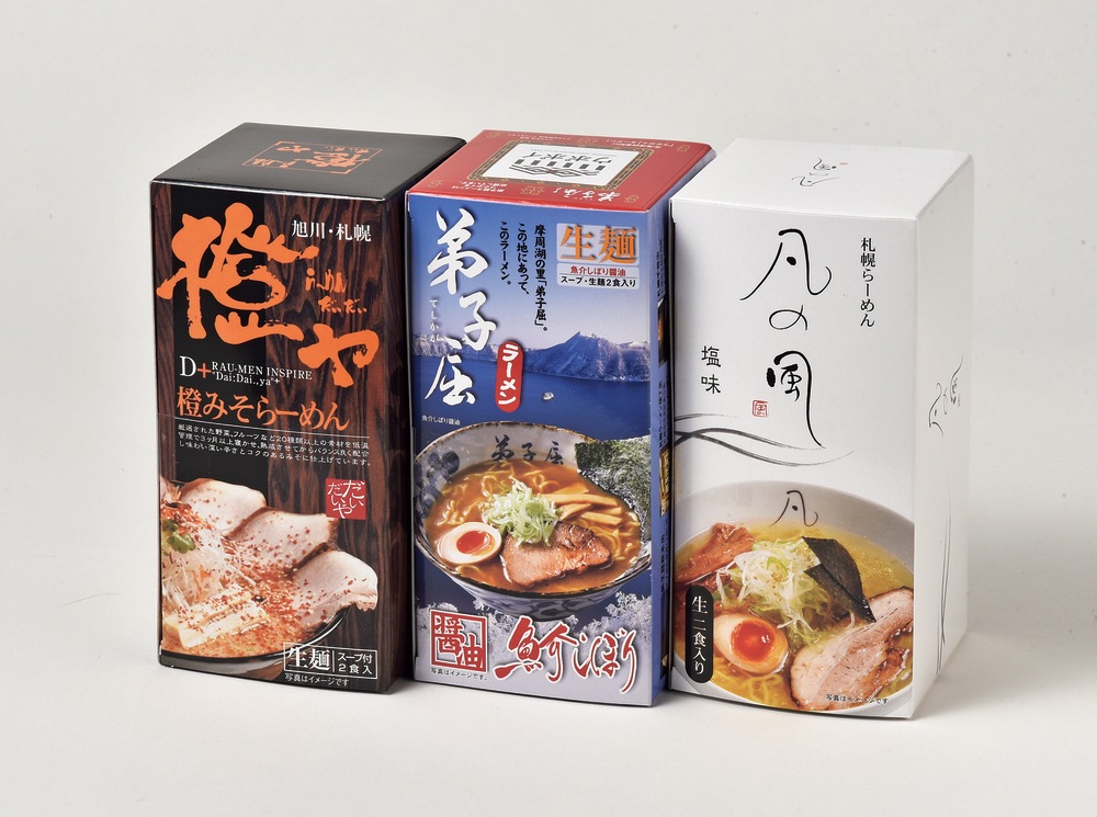 | 原材料 | 橙ヤ味噌: めん:小麦粉(国内製造)、卵白粉、食塩/酒精、加工でん粉(打ち粉)、かんすい、着色料(クチナシ)、(一部に小麦・卵を含む) スープ:味噌(国内製造)、動物油脂、砂糖混合異性化液糖、りんごペースト、ポークブイヨン、ソテーオニオン、香辛料、食塩、植物油脂、野菜エキス、ごま/調味料(アミノ酸等)、酒精、カラメル色素、増粘剤(キサンタン)、酸化防止剤(ビタミンE)、パプリカ色素、(一部に小麦・ごま・大豆・鶏肉・豚肉・りんごを含む) 弟子屈(てしかが)魚介しぼり醤油: めん:小麦粉(国内製造)、小麦たん白/酒精、加工でん粉(打ち粉)、かんすい、着色料(リボフラビン)、(一部に小麦を含む) スープ:しょうゆ(北海道製造)、白湯スープ、野菜エキス、ガラスープ、豚脂、ポークエキス、鰹エキス、白菜、さば削りぶし、発酵調味料、ほたてエキス、えび、かつお削りぶし(粉末)/調味料(アミノ酸等)、増粘剤(加工澱粉)、香料、(一部に小麦・乳成分・えび・大豆・さば・豚肉・鶏肉を含む) 凡の風塩味: めん:小麦粉(国内製造)、小麦たん白/酒精、加工でん粉(打ち粉)、かんすい、着色料(リボフラビン)、(一部に小麦を含む) スープ:食塩(国内製造)、チキンオイル、植物油脂、野菜(玉ねぎ、しょうが、にんにく)、ポークエキス、香味食用油、発酵調味料、鶏ガラスープ、鰹節エキス、ビーフエキス、オニオンパウダー、ごま、しいたけエキス、香辛料/調味料(アミノ酸等)、酒精、増粘剤(加工でんぷん、キサンタンガム)、甘味料(甘草)、pH調整剤、カラメル色素(一部に卵・小麦・牛肉・大豆・さば・鶏肉・豚肉・ごまを含む) |