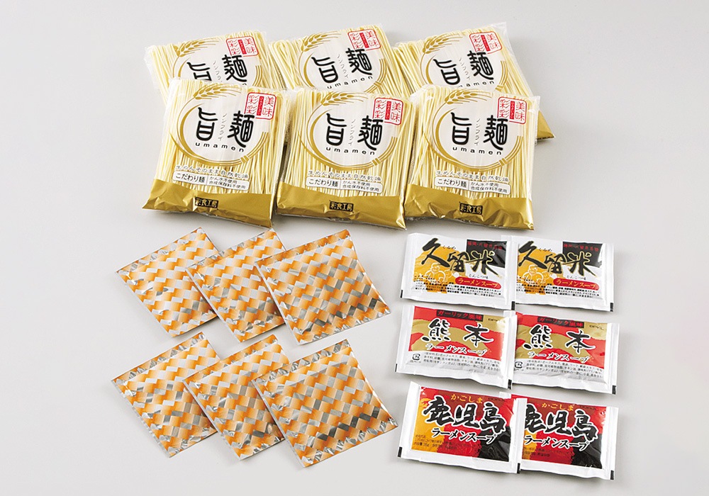 かん水を使用していない生麺を48時間熟成乾燥させ、うま味を凝縮させたノンフライの「旨麺」に、「豚骨を長時間煮込み独特な匂いと後味がたまらない久留米スープ」、「鹿児島の黒豚エキスを加え旨味と風味豊かなこってり鹿児島スープ」、「豚骨をベースにローストガーリックの風味が効いた旨味の強い味わいの熊本スープ」の3種類の豚骨スープで九州の味を堪能できるセットです。