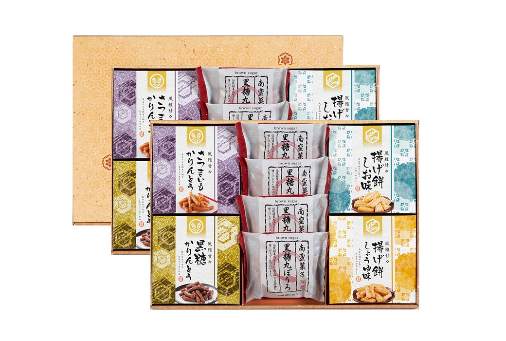 | 内容量 | 黒糖丸ぼうろ:×8個 揚げ餅(しお味):20g×2個 揚げ餅(しょうゆ味):20g×2個 さつまいもかりんとう:30g×2個 黒糖かりんとう:30g×2個 |