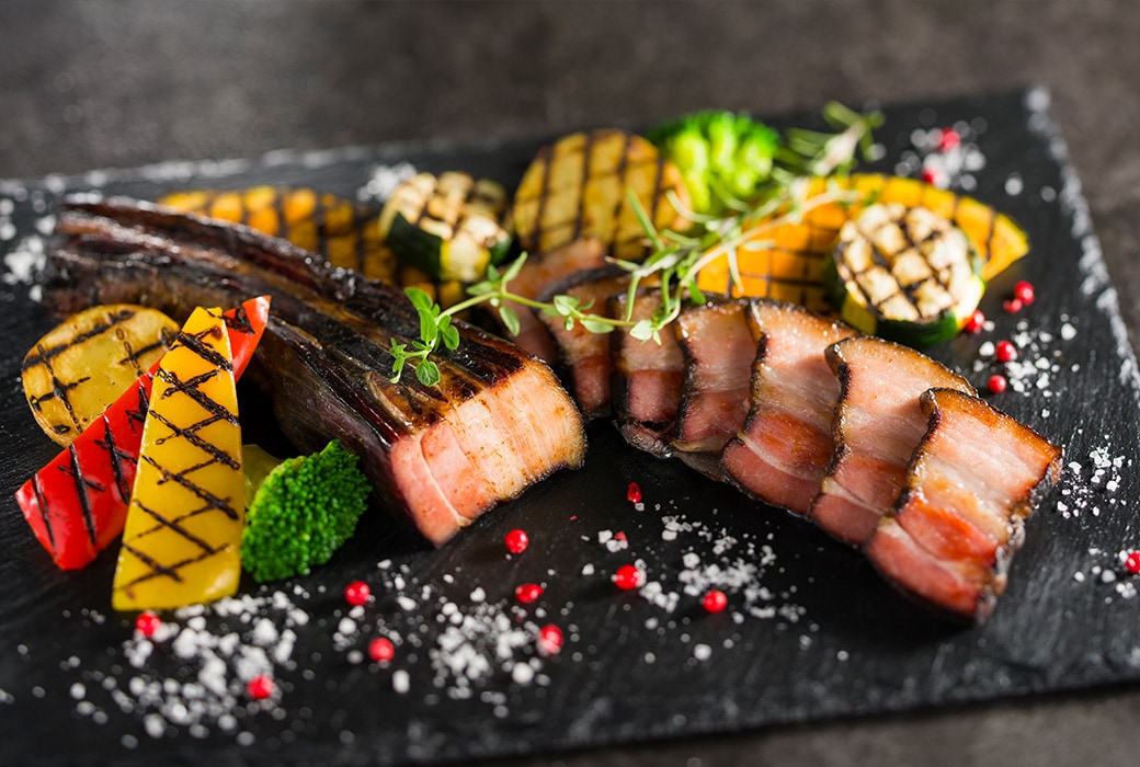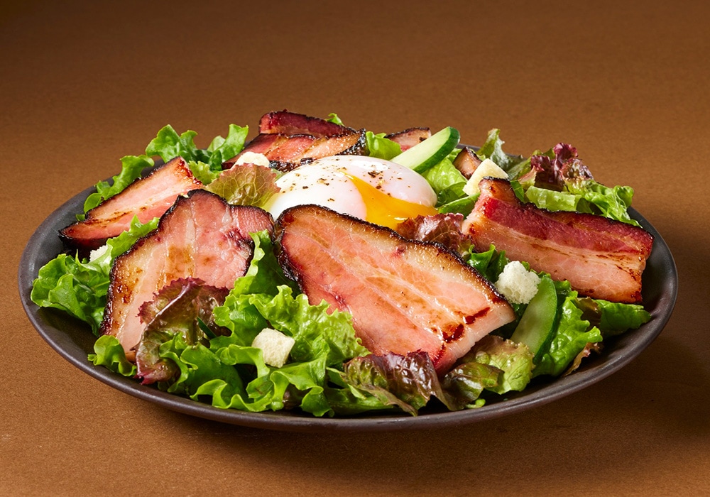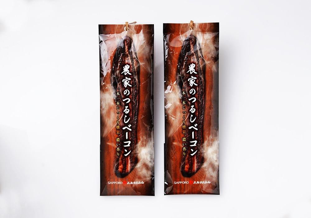 素材の味を引き立てるシンプルな味付けに、当社のこだわり製法である特徴的な黒い表面仕上げの農家のベーコン。ひとつひとつ丁寧に味付けした豚バラ肉を低温熟成し、じっくり燻煙と加熱を施すことで、煙がまんべんなく行き渡り、従来の農家のベーコンに比べ、より豊かな燻製の香りを感じられます。