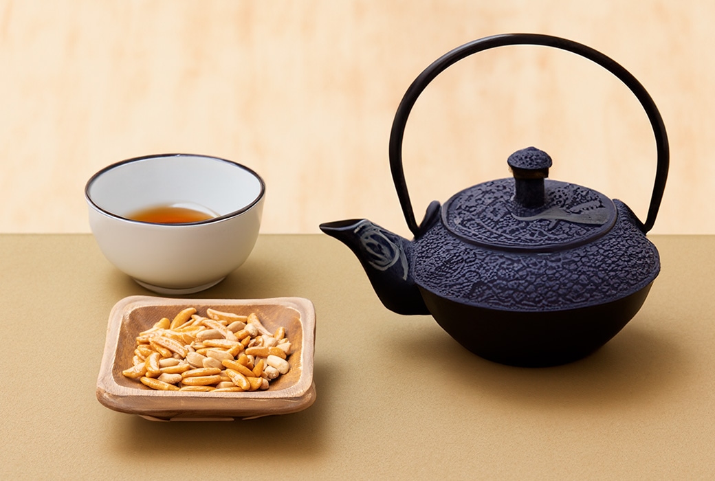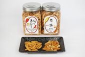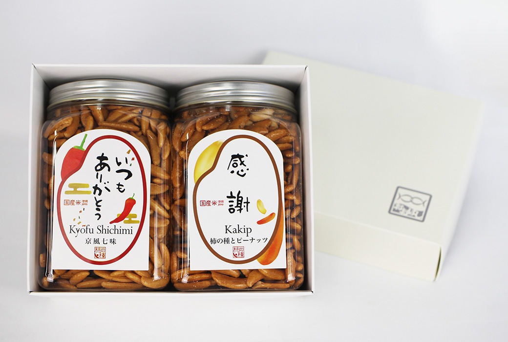 保存に便利なポット容器入り。国産米使用。山椒のきいた京風七味あじの柿の種とベーシックな醤油味と甘みのある千葉産ピーナッツをミックスした柿の種のセットになります。