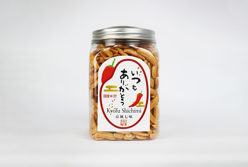 山椒の香り高い京風七味味の柿の種です。国産米使用。