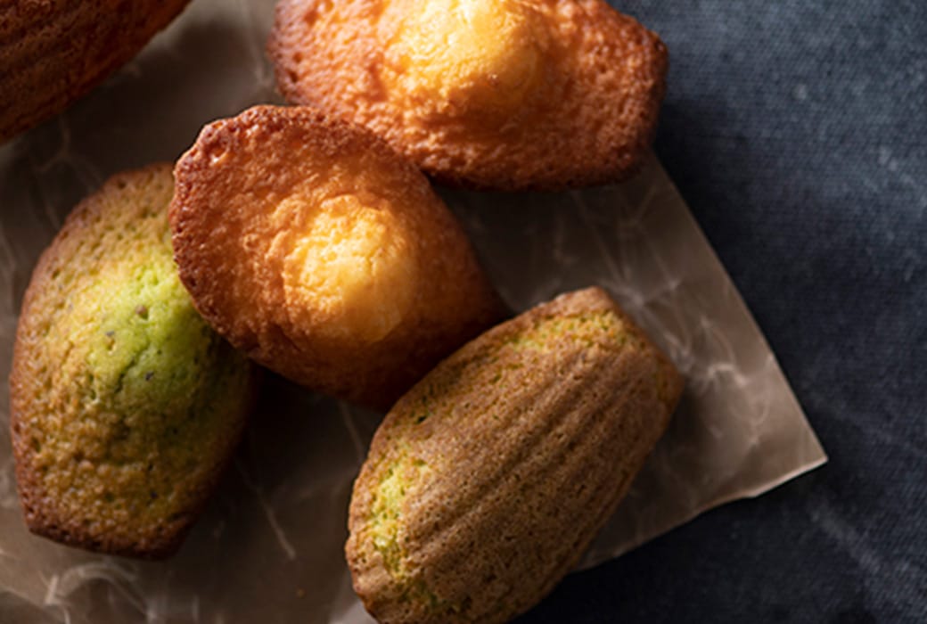 芳醇なレモンの香りが決め手のプレーンと、ナッツの女王ピスタチオを使用した贅沢な2種類のマドレーヌ。ぷっくりと焼き膨らんだ形がポイント。